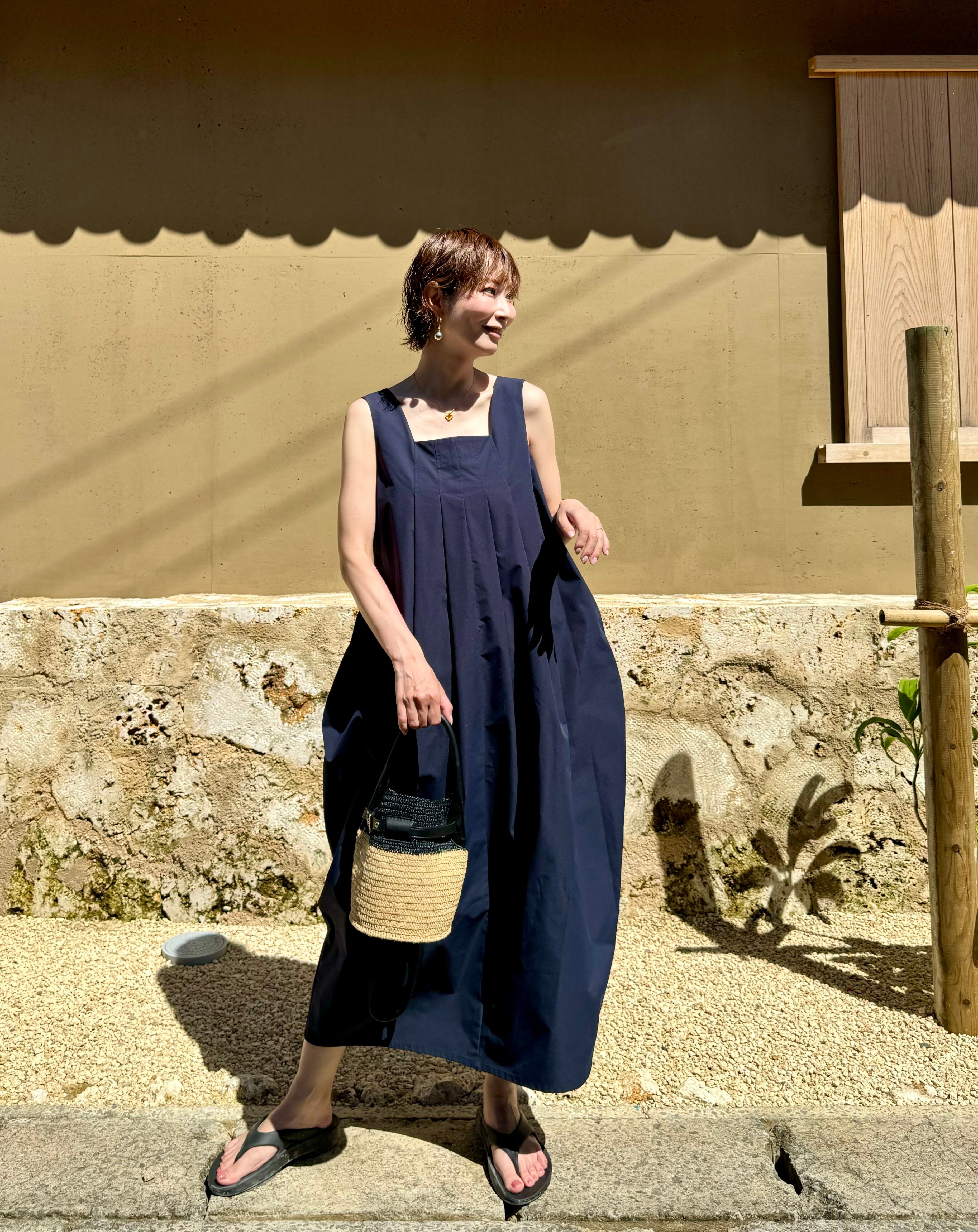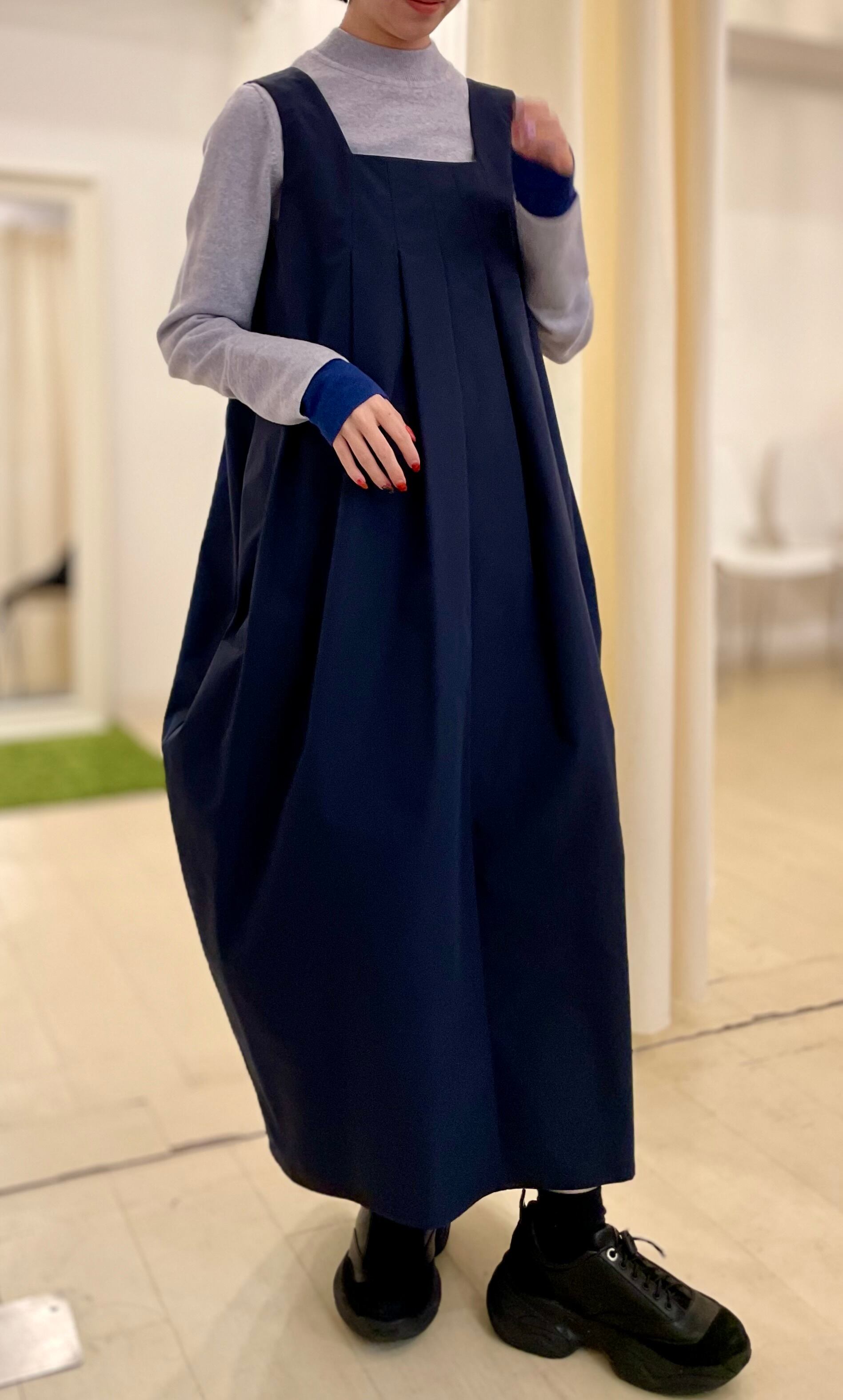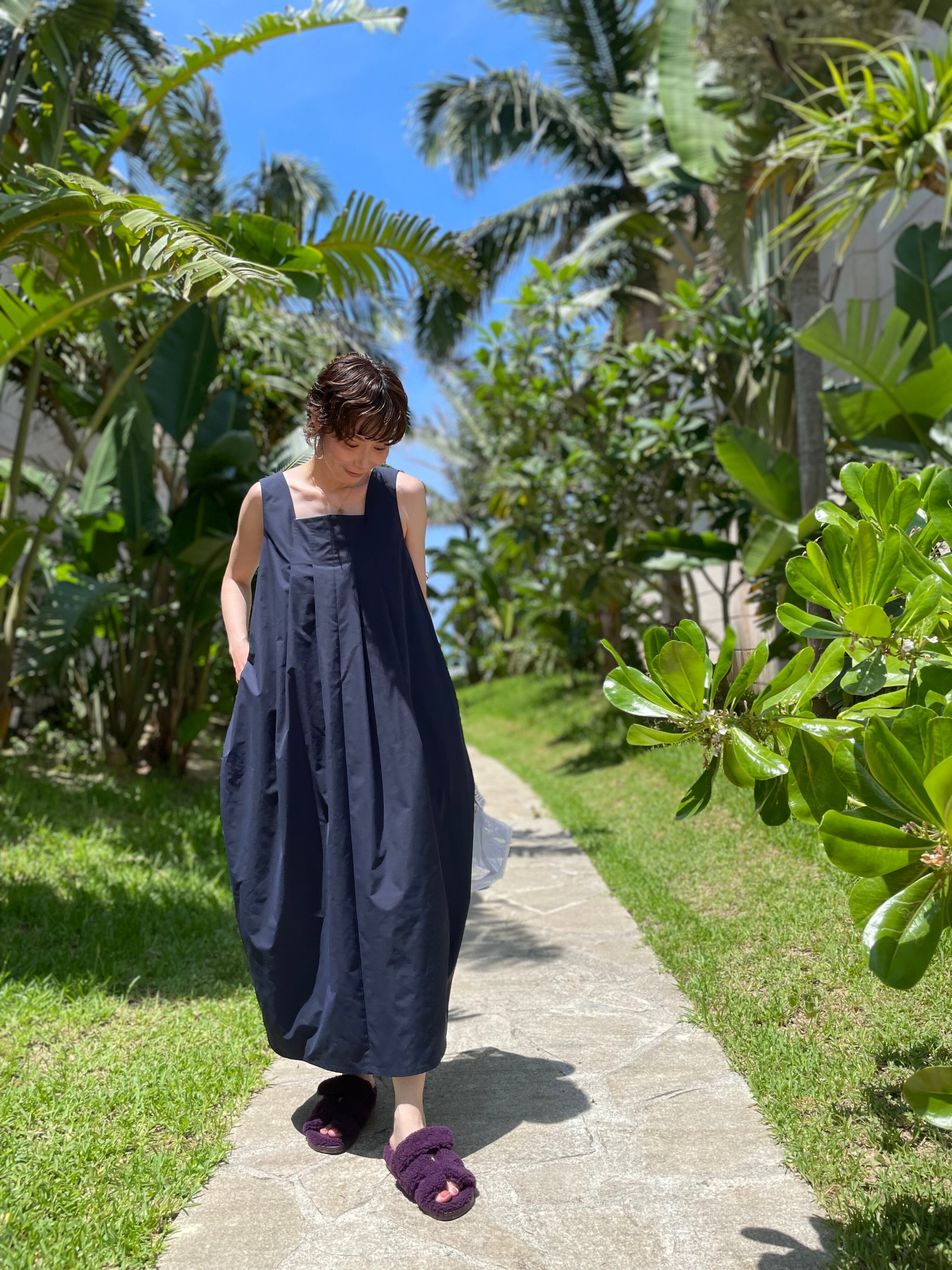 前後共に、すっきりとしたスクエアネックのコクーンワンピース。