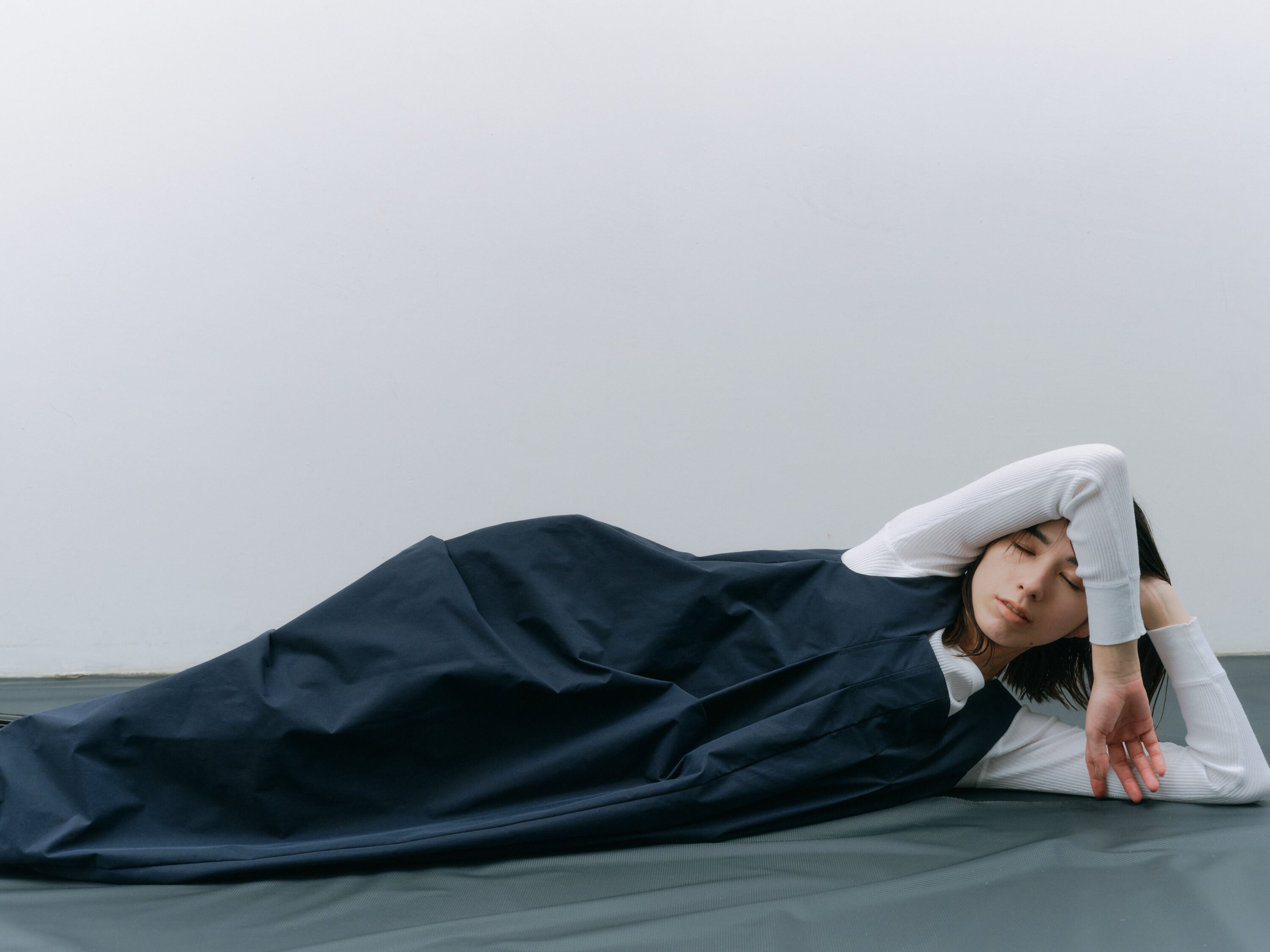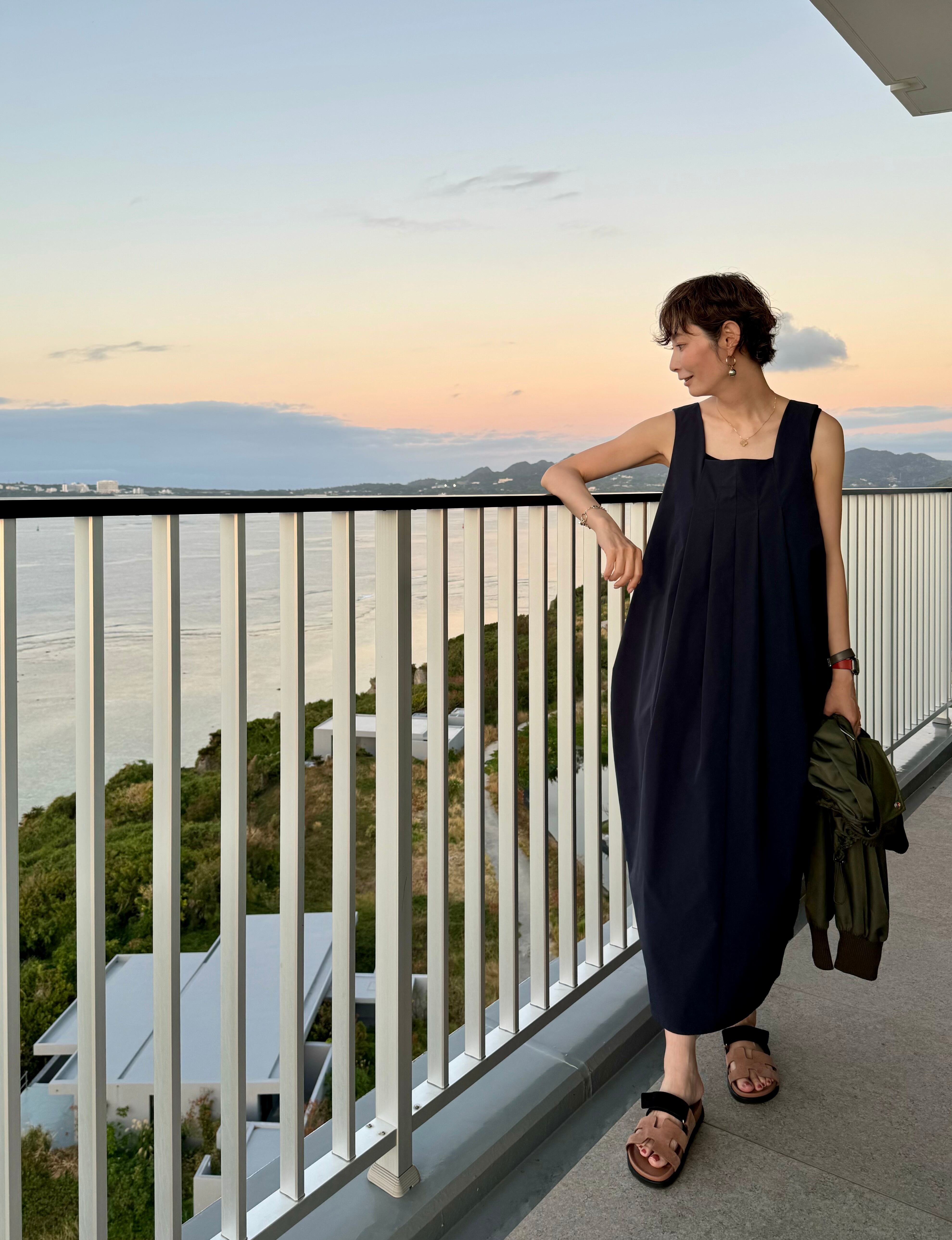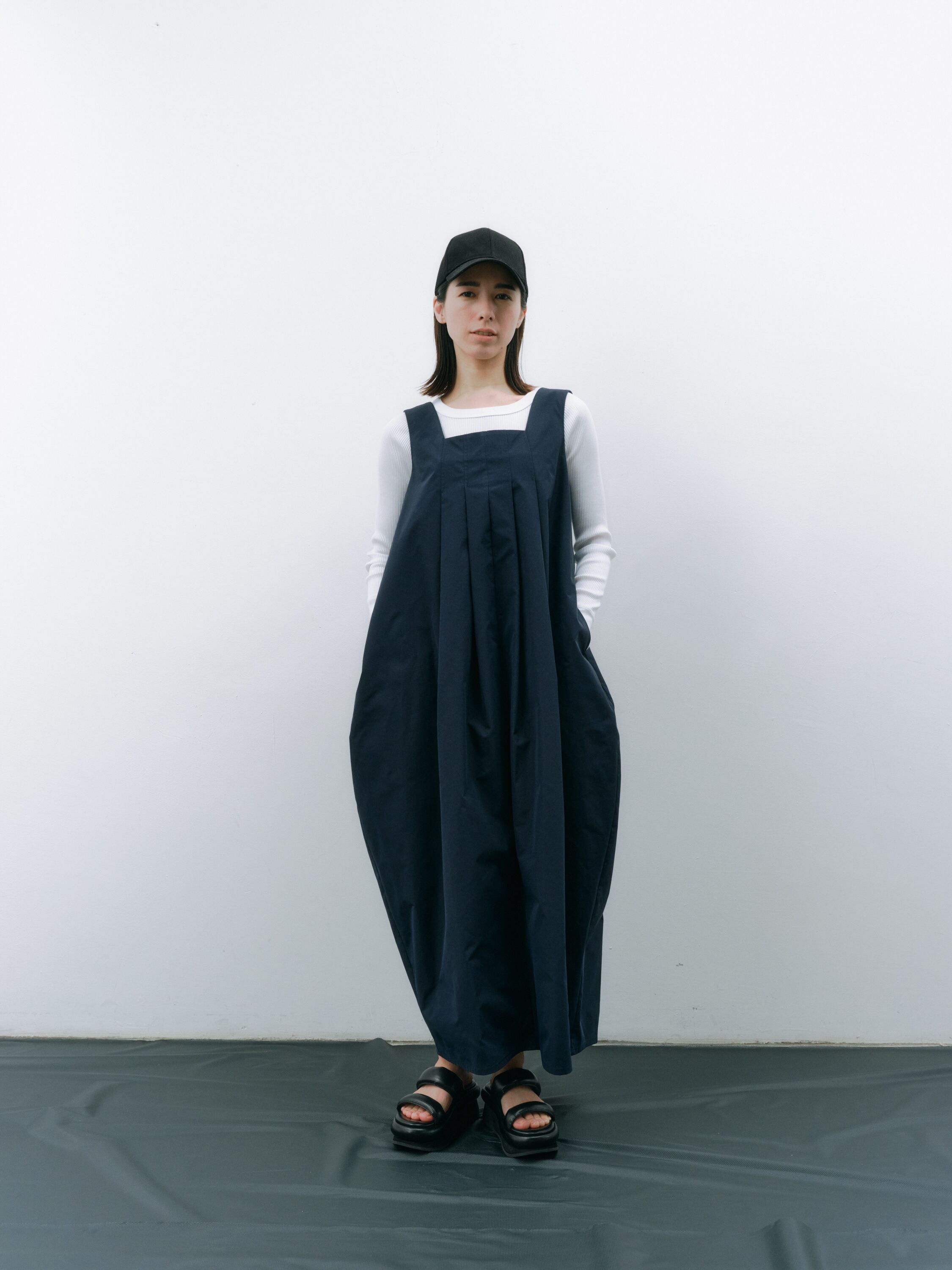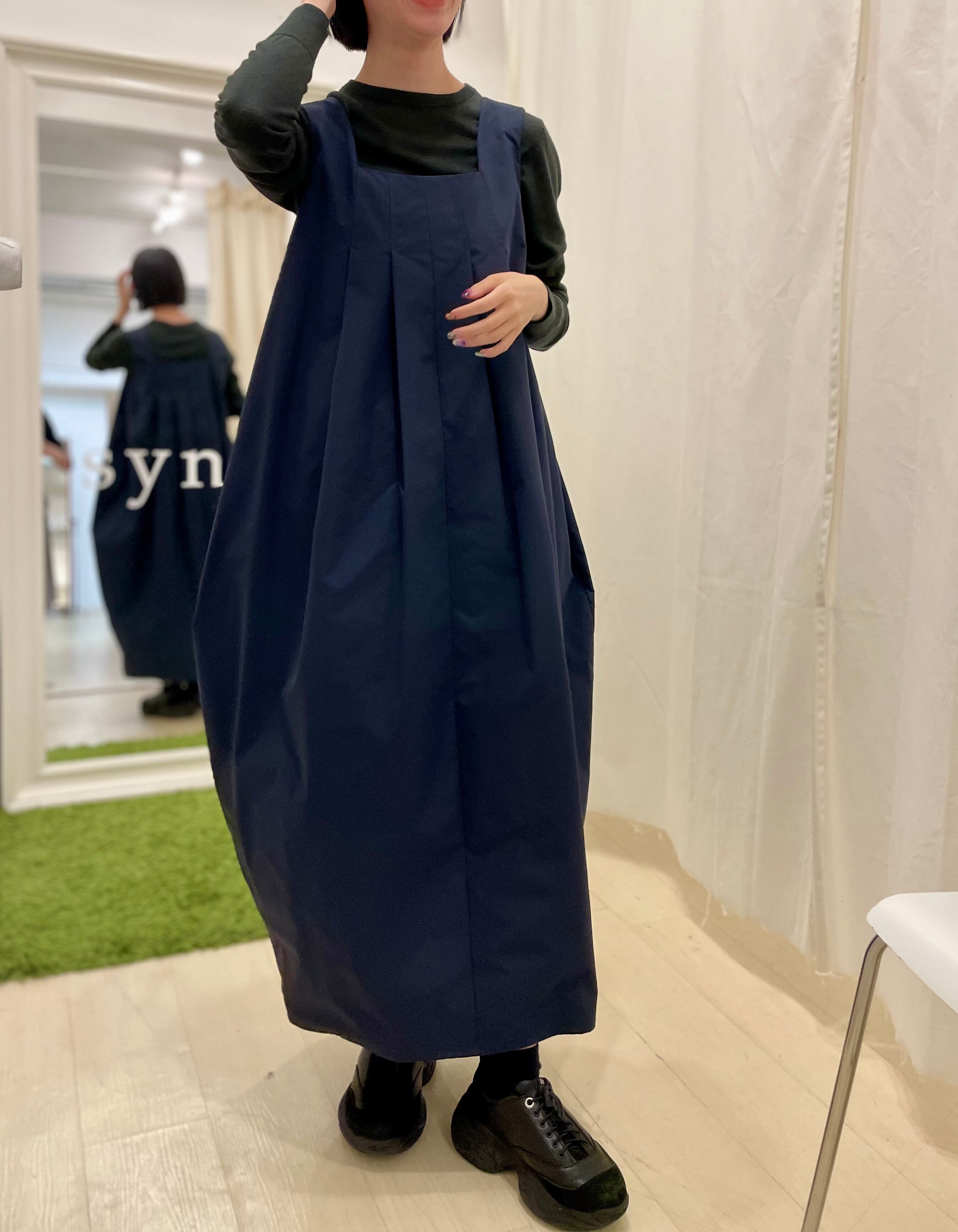 前後共に、すっきりとしたスクエアネックのコクーンワンピース。