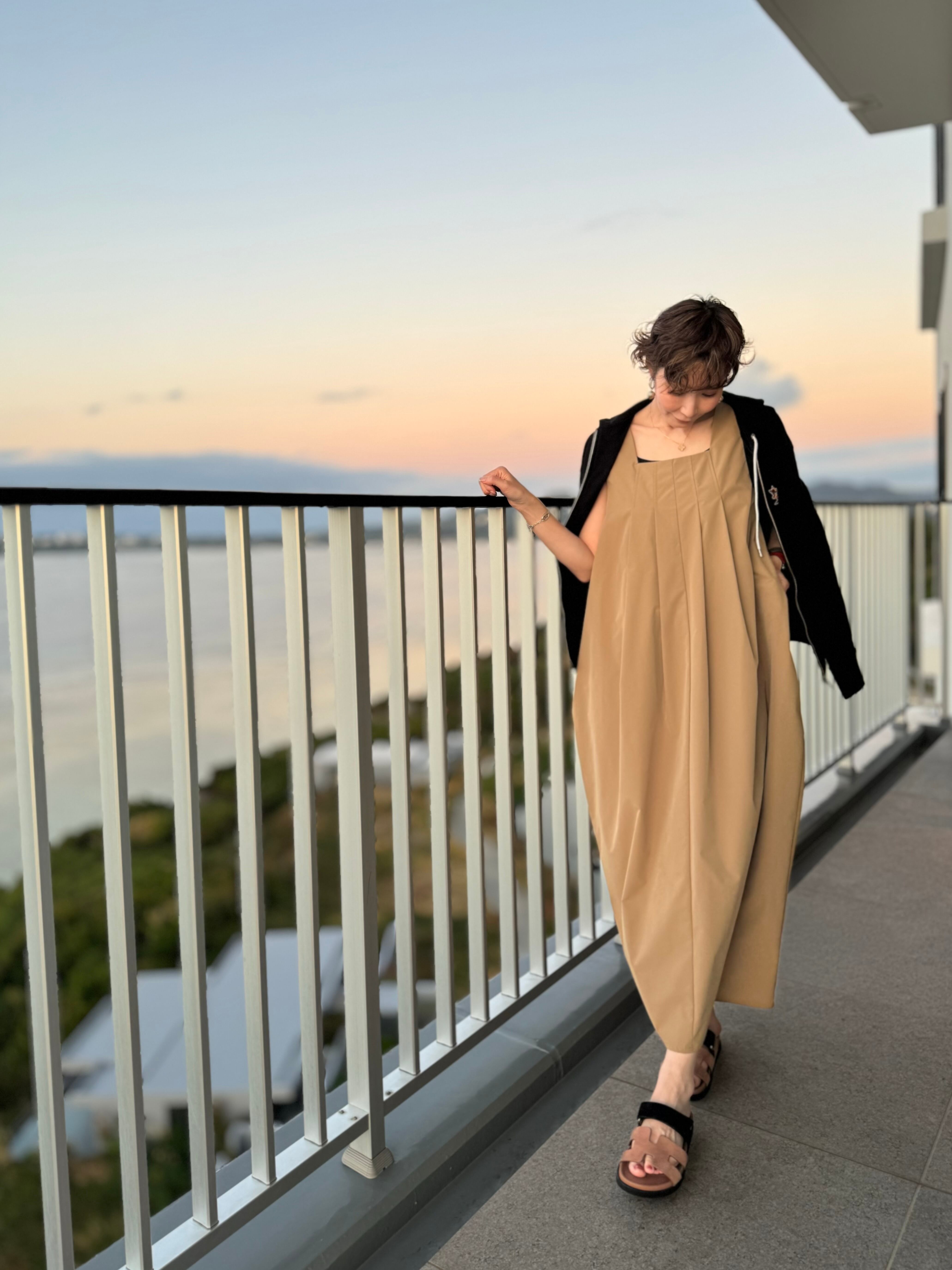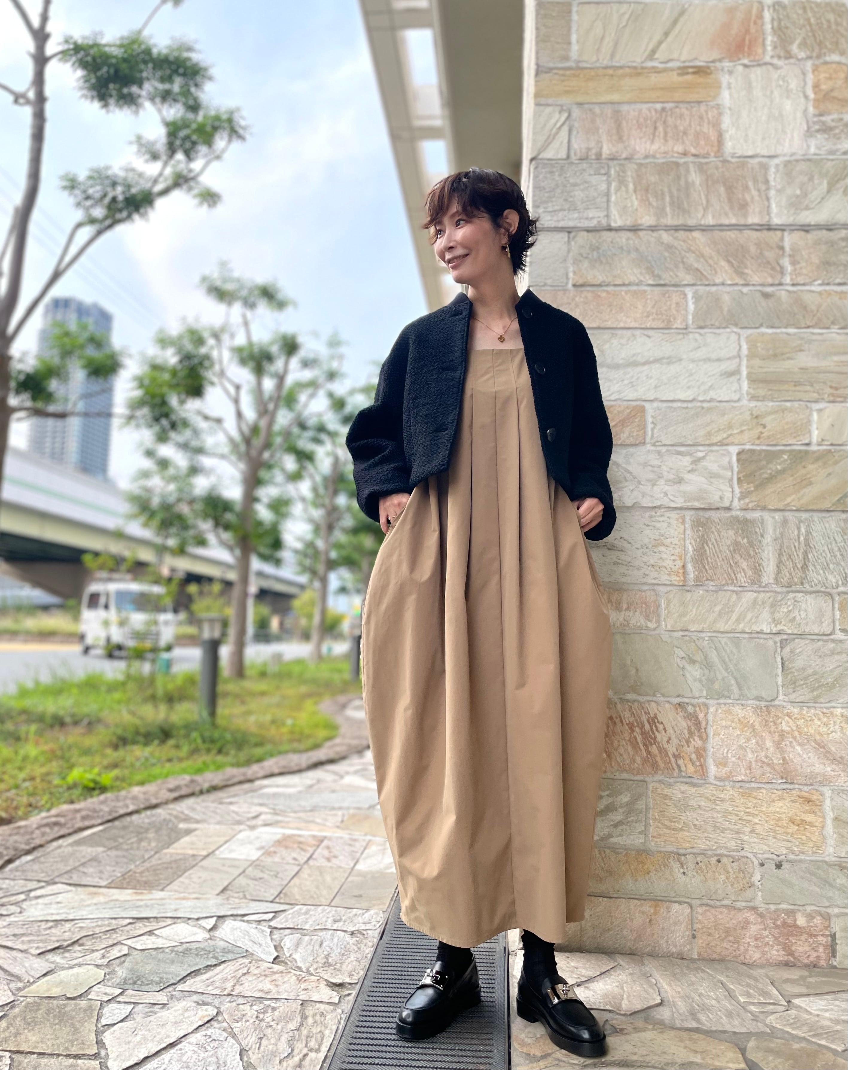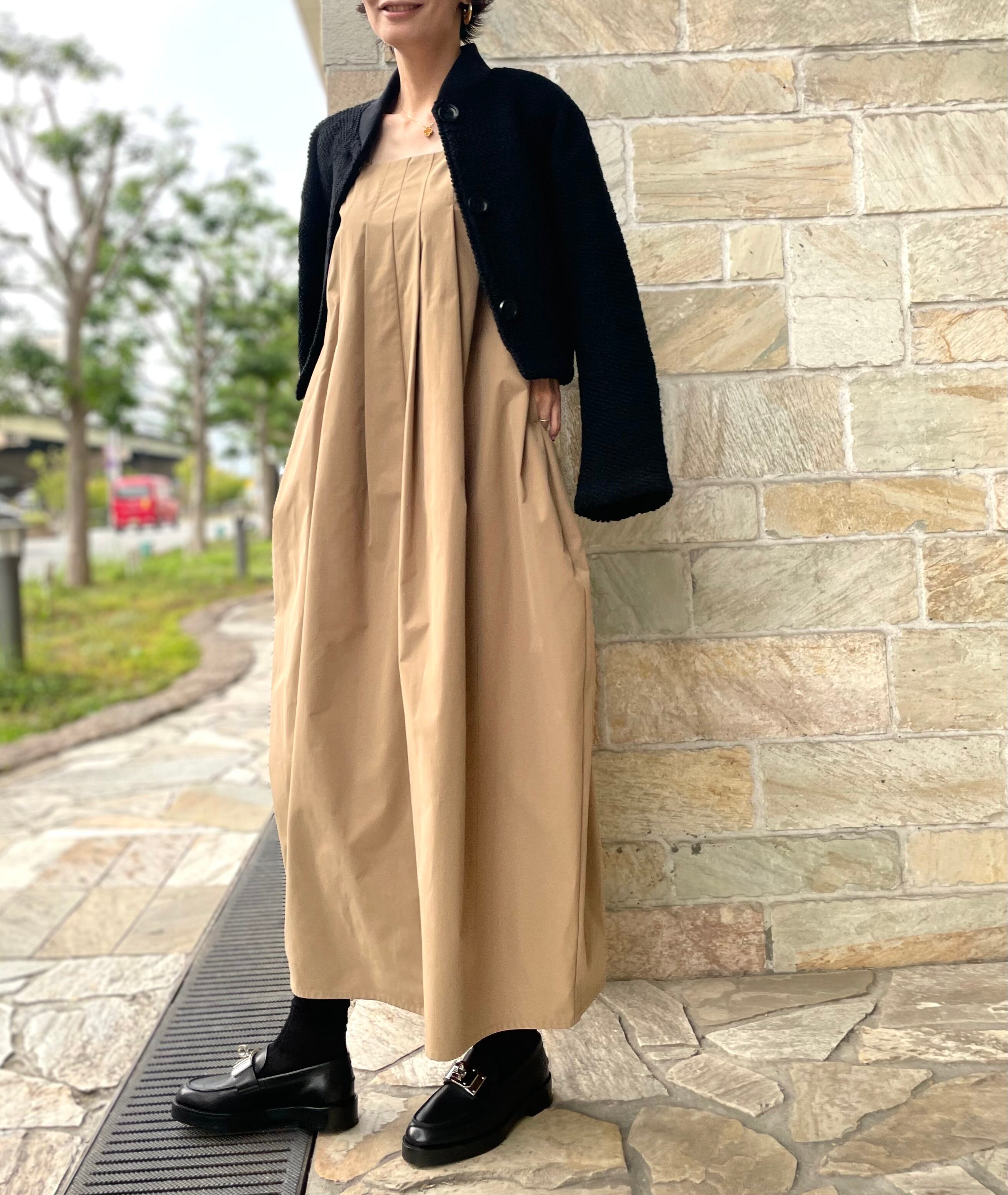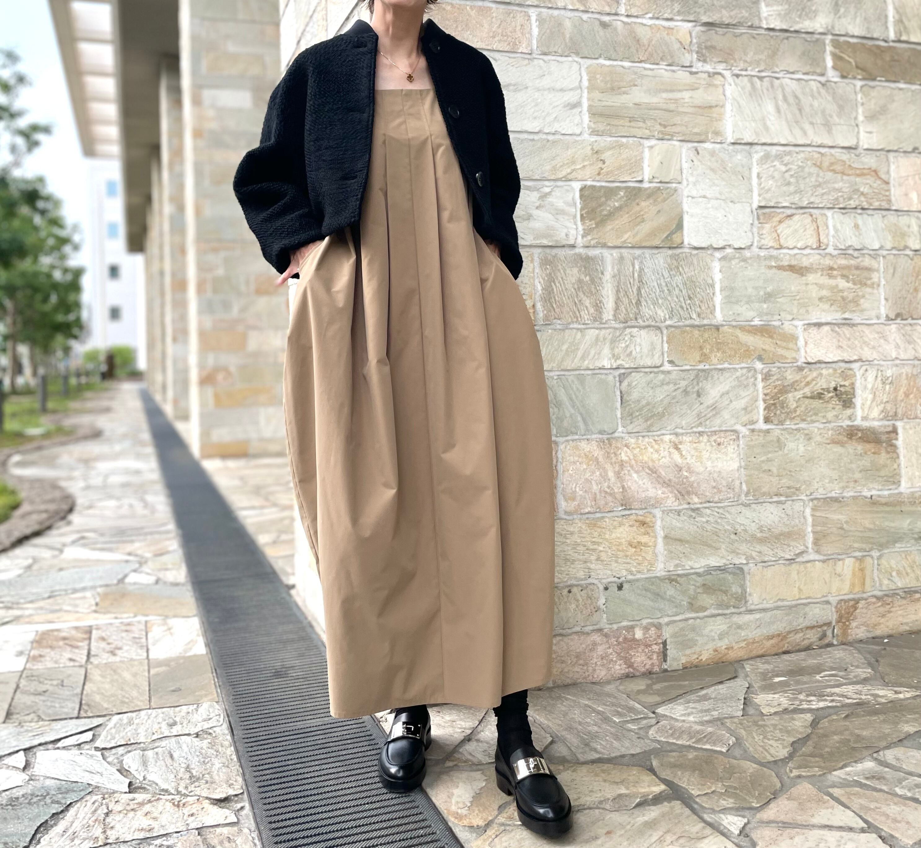 合わせるアイテムにより、カジュアルにもモードにもエレガンスにも適応できるワンピース。