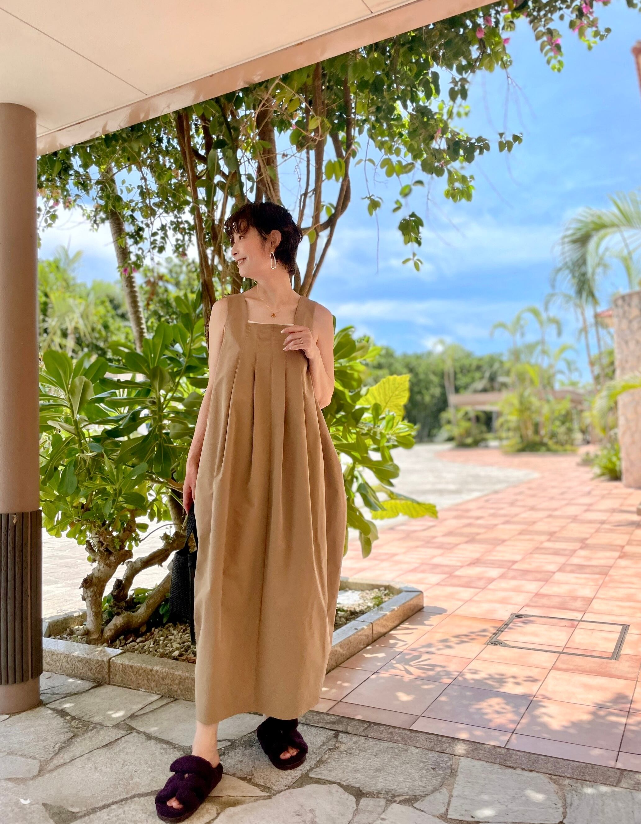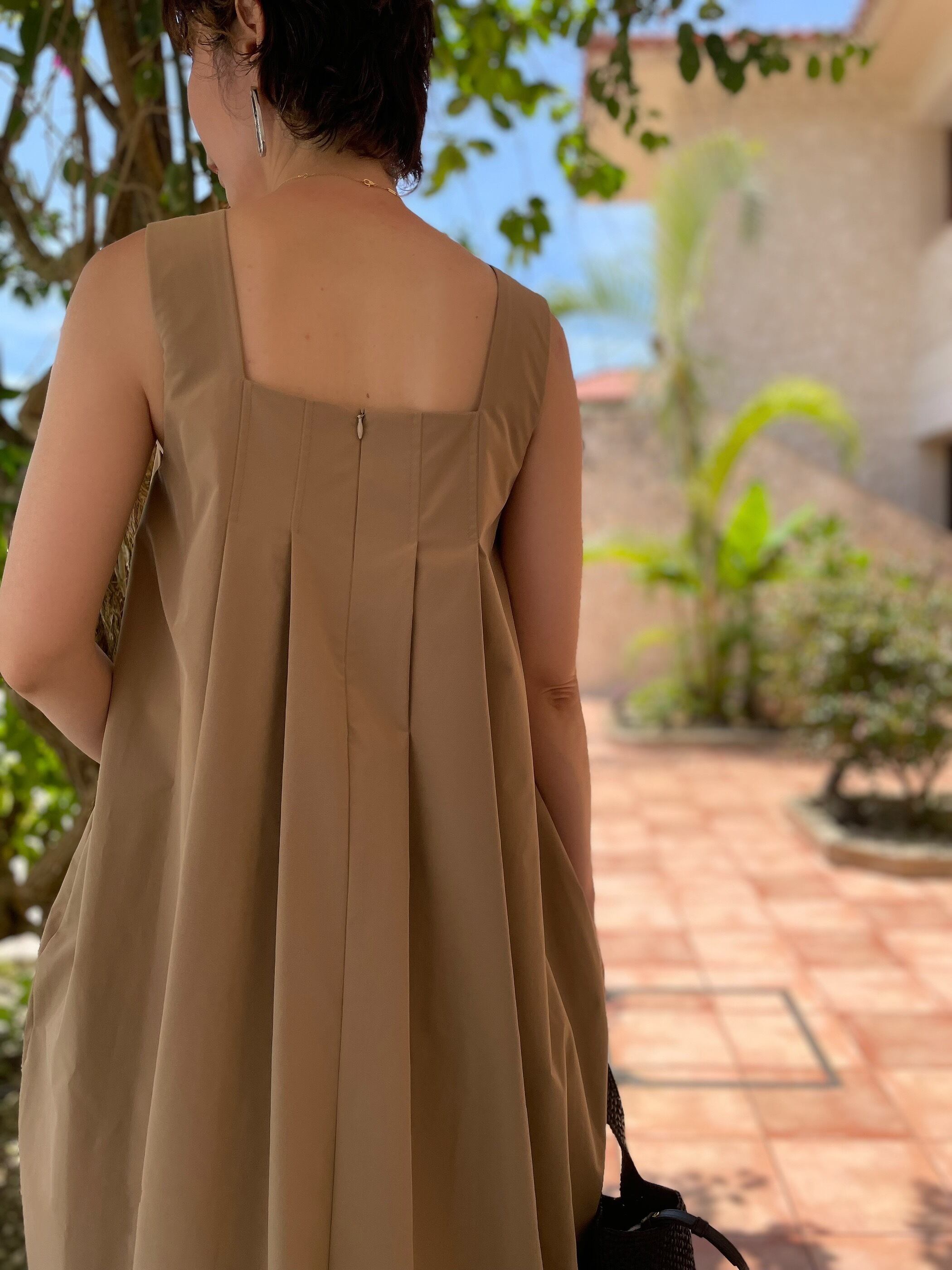 前後共に、すっきりとしたスクエアネックのコクーンワンピース。