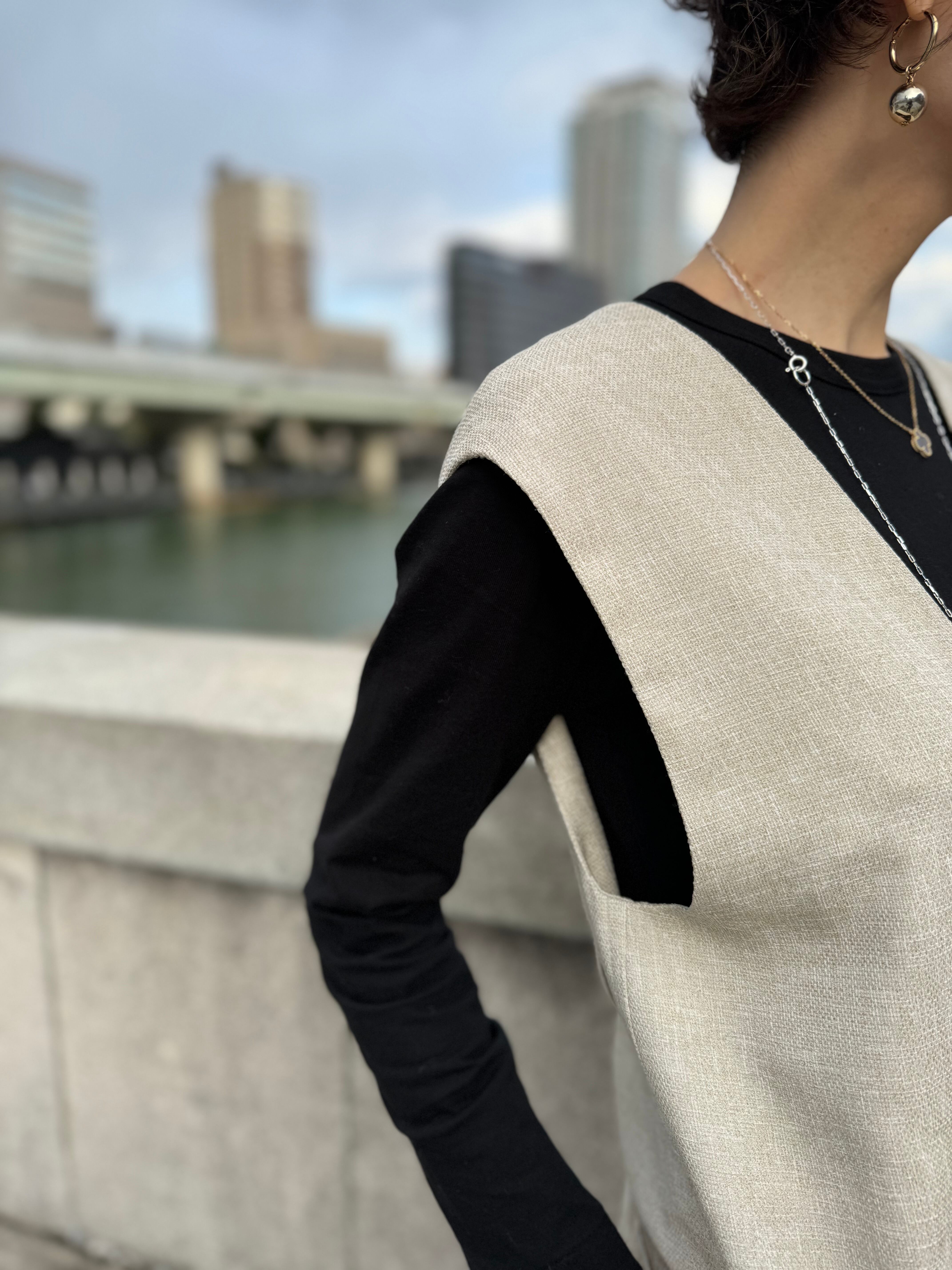肩にかかる大きめのVネックが、肩や二の腕、胸脇など気になるポイントをカバー。