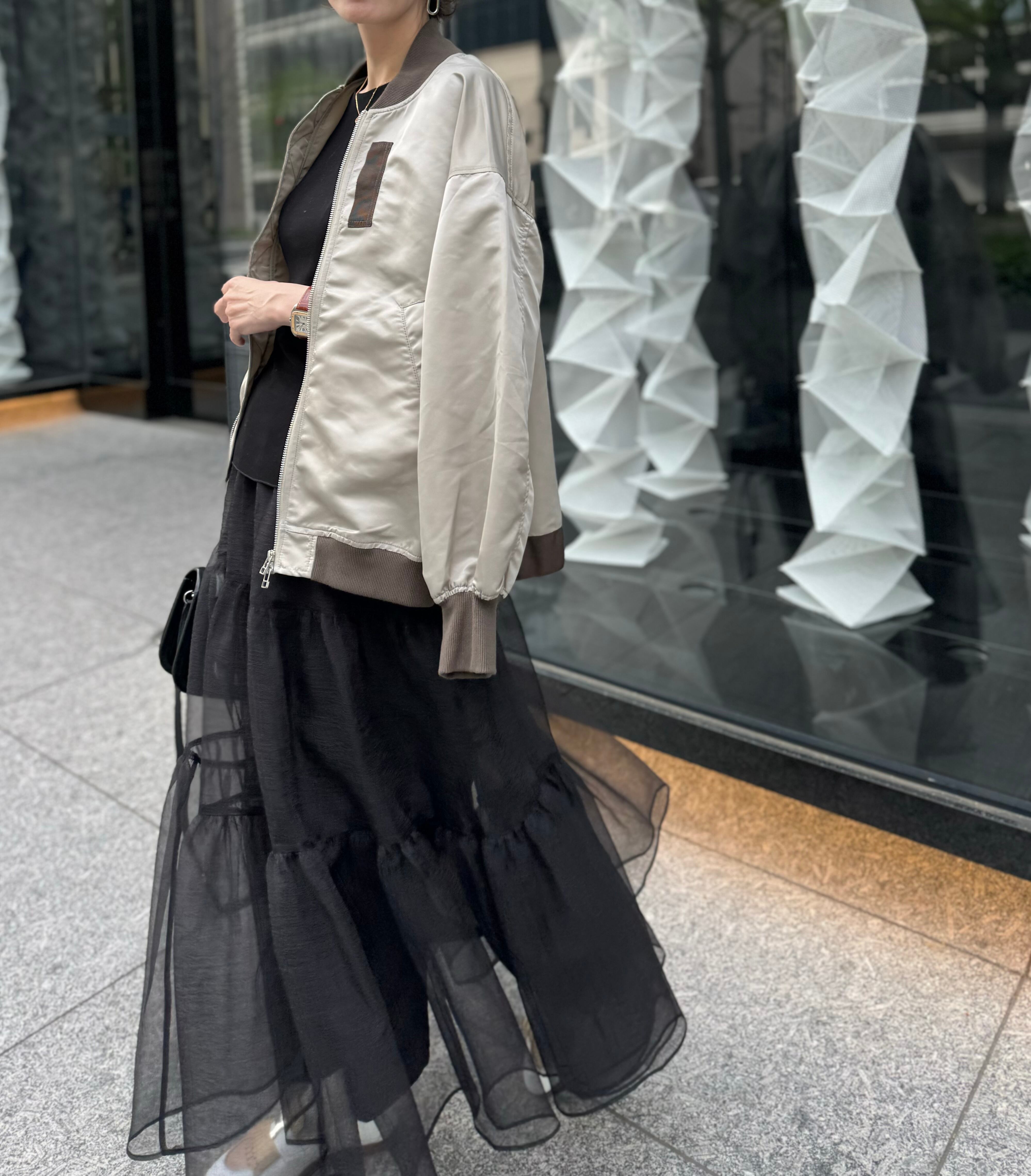 MA1 LIKE JACKET グレージュカラーは、メンズライクな雰囲気のMA1ジャケットを女性らしくアレンジした一着です。