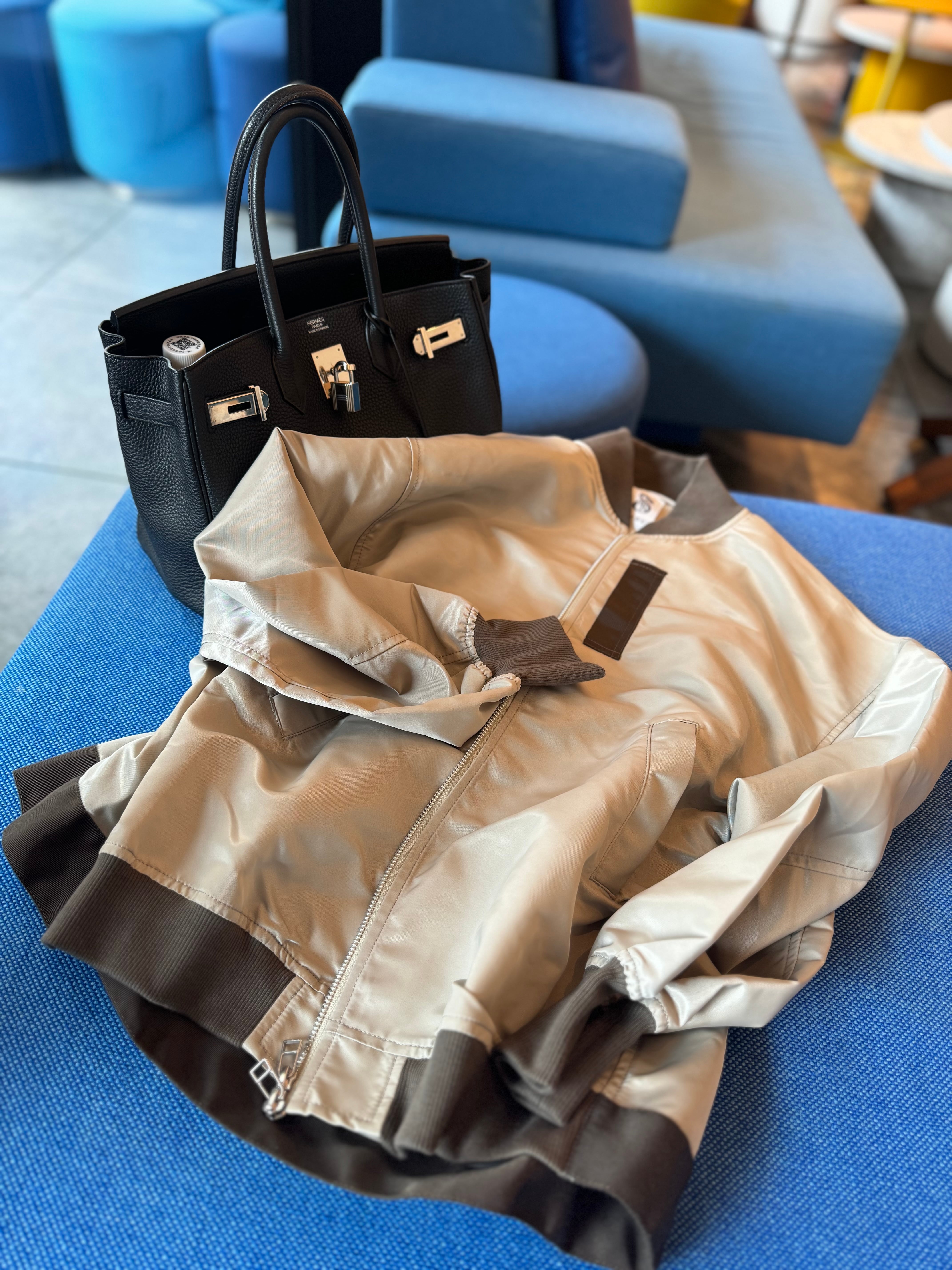 バイカラーが大人カジュアルになり、光沢のある生地がシックで大人っぽい印象を与えます。