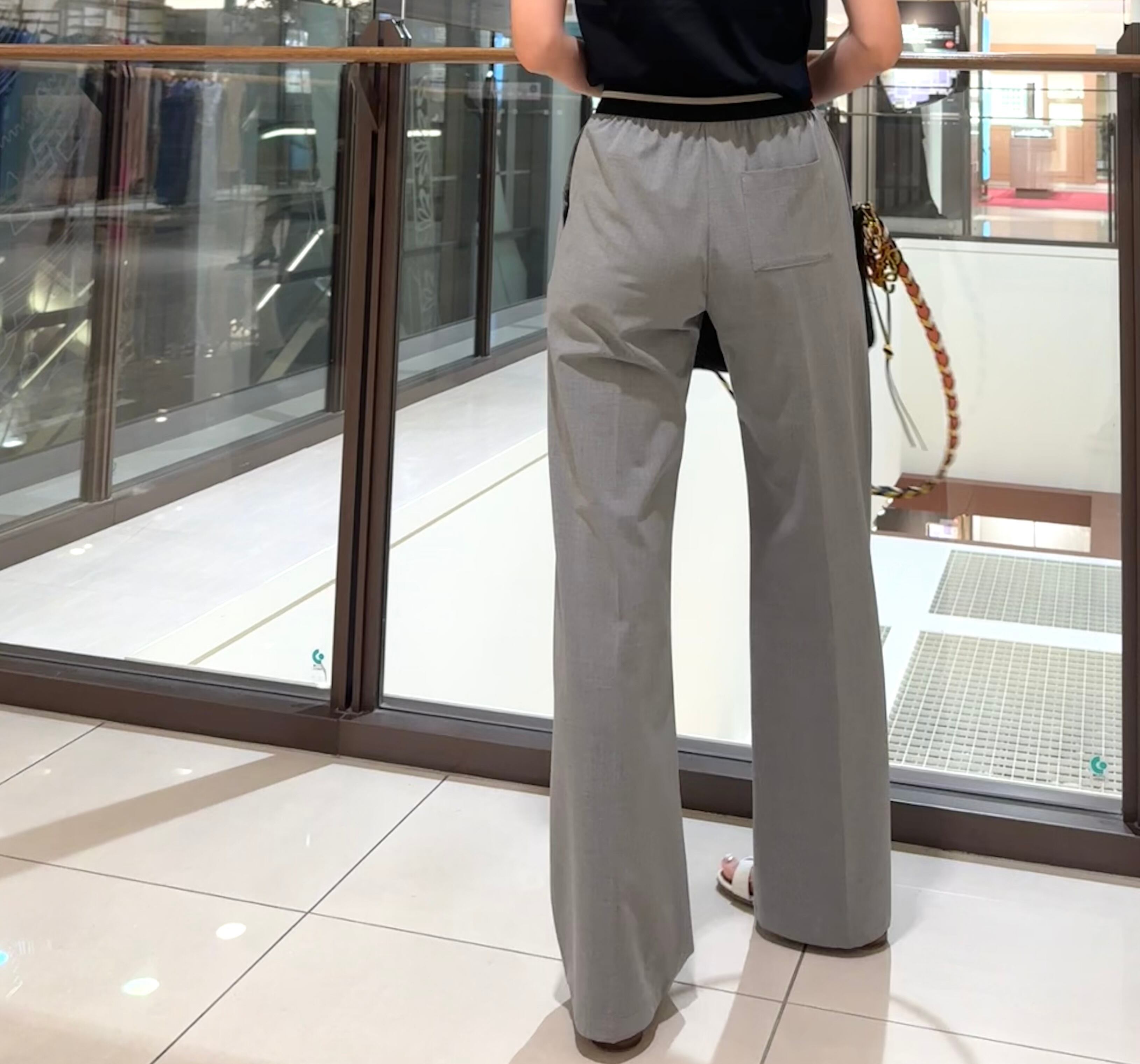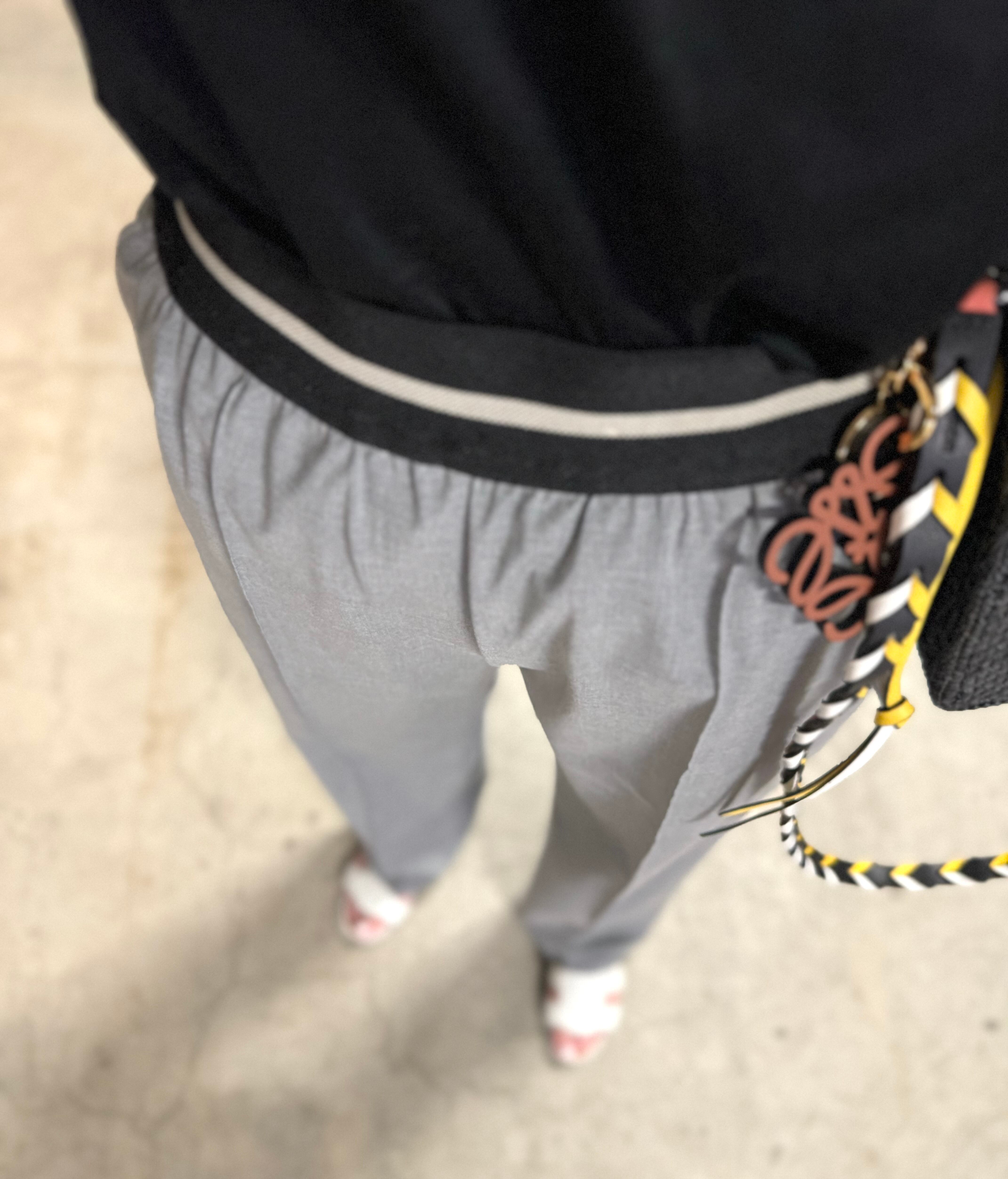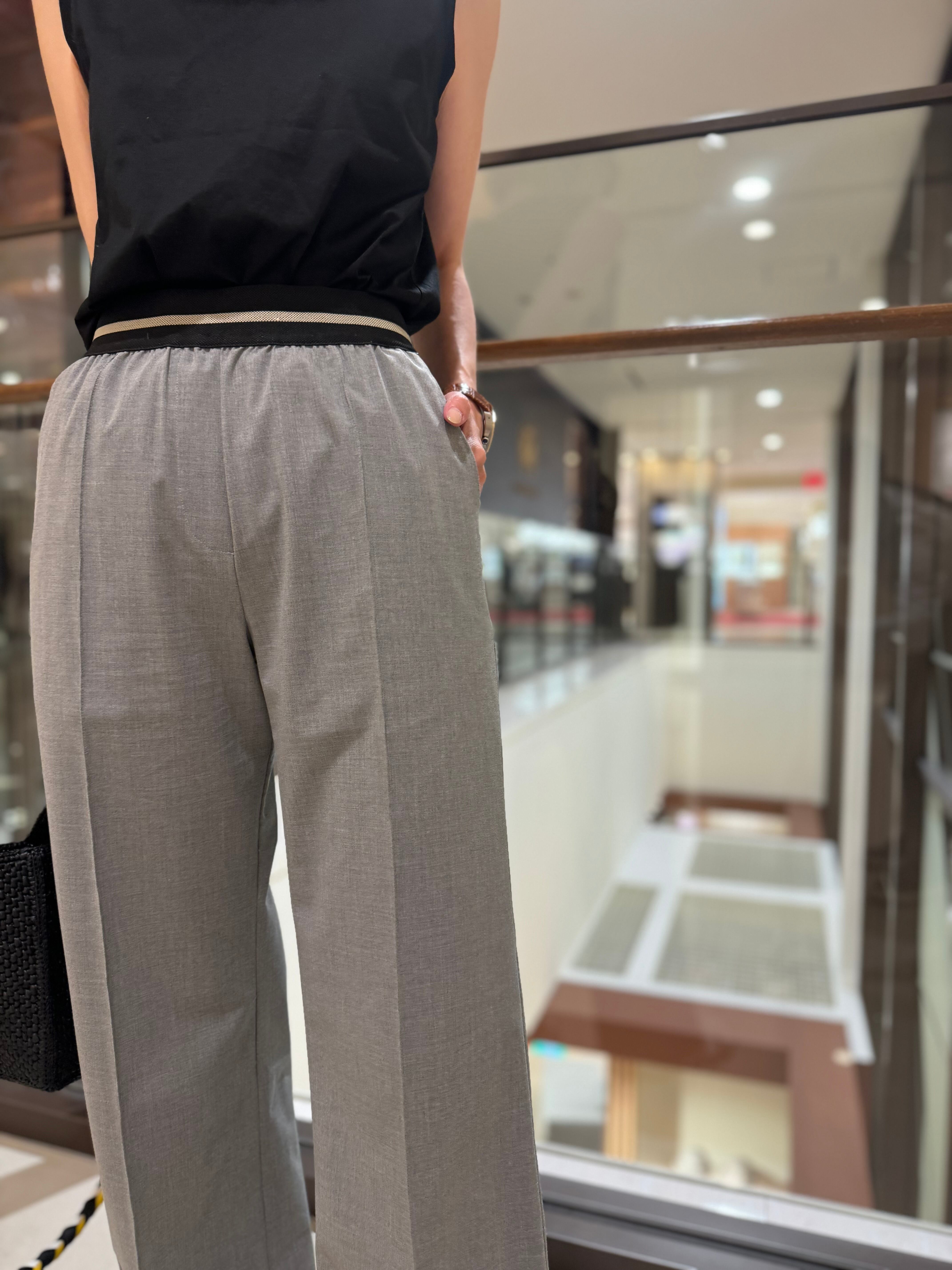 ウエストゴムは、ラインも入っているのでベルトをしなくてもポイントになり、もちろんトップスを上からかぶせての着用も、パンツラインがすっきり見えて美脚効果抜群のパンツです。