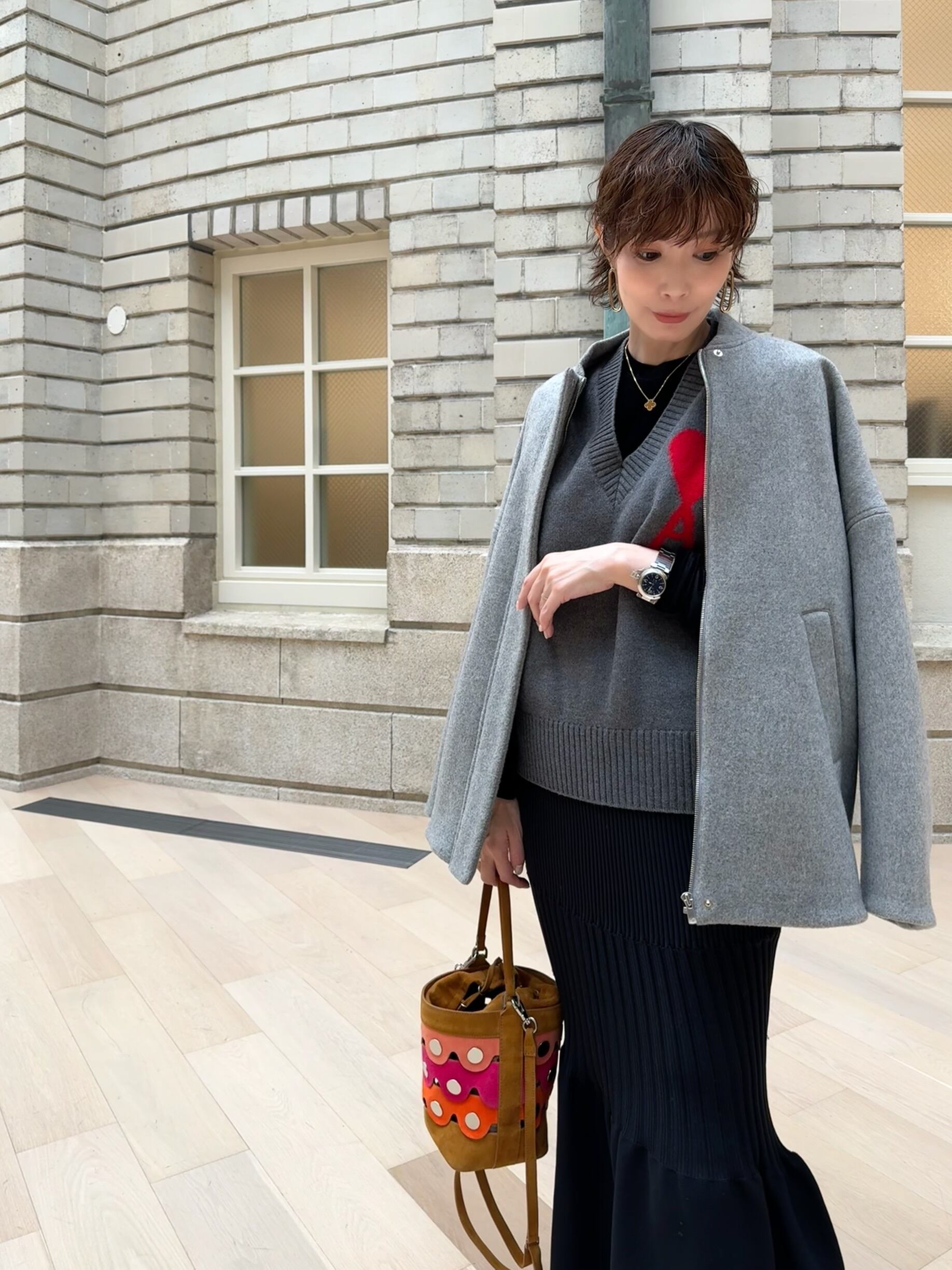 上品なグレーは、顔周りを明るくし、落ち着いたイメージでいろんなコーディネートに合わせやすいのが魅力です。